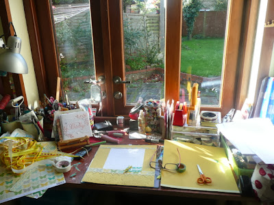 Look dear Desker at my desk, two hours apart. DIFFERENT mess! Yep, I finished the lovely cheerful yellow page (which is actually for the calender workshop next month), I TIDIED up and then re-started! Amazing. See, sometimes, when I need to, I can. The floor is covered in rubbish..bits of die cut waste, the cutting station is piled high with well, cuttings, and the bin overfloweth. But I'm satisfied. Makes a change huh! You can see through the wonders of non time lapse that I had been heat embossing (my treasured, now 15 year old heat gun) and that I had quaffed a mug of hot chocolate to give me a bit of a sugar lift. Keeps me going till supper. And so, I must tidy, ready to start again. Well, tidy-ish, obviously, nothing too time consuming!